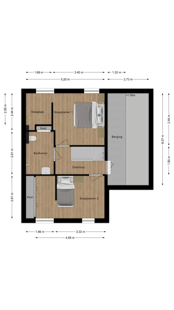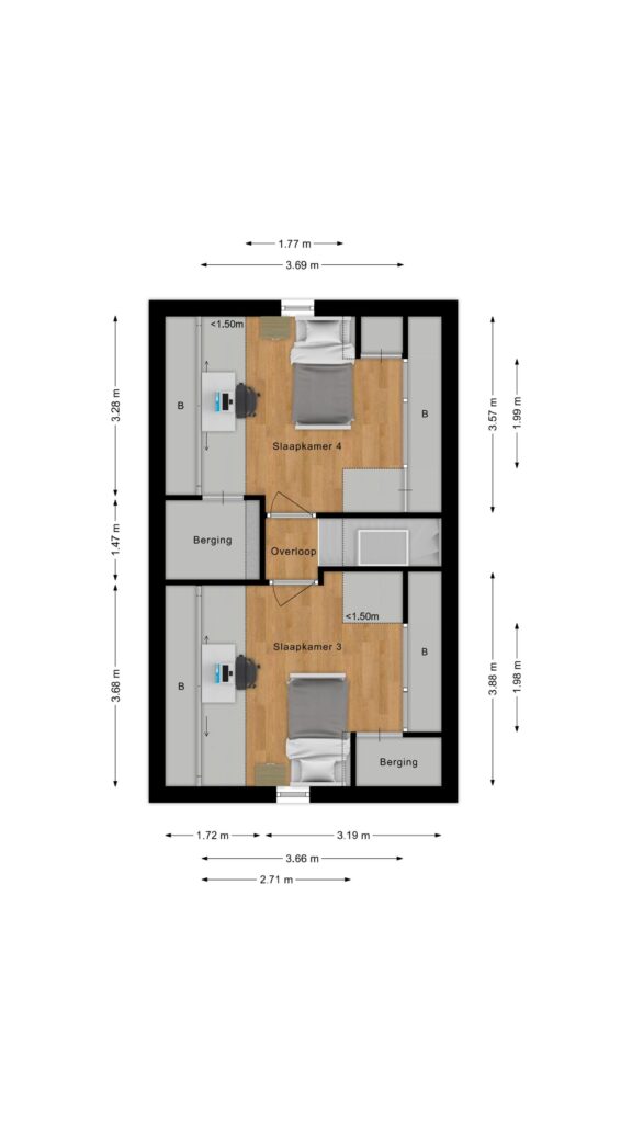 De tweede verdieping beschikt over nog eens twee ruime slaapkamers. Ook hier is gedacht aan extra bergruimte, net als op de andere woonlagen. Aan opslag dus geen gebrek!