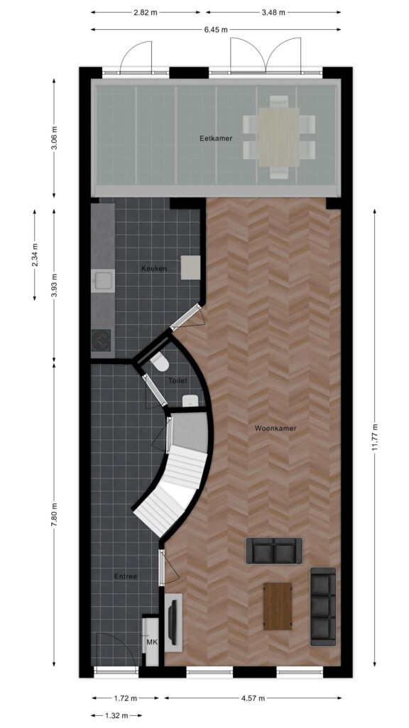 Achter de elegante gevel gaat een wereld van ruimte en licht schuil. De hoge plafonds, sierlijke details en royale indeling geven dit huis een voorname uitstraling. De woonkamer vormt een uitnodigend hart, waar oude charme en modern wooncomfort elkaar ontmoeten. Dankzij de aangebouwde serre wordt elke dag een beetje lichter, elke maaltijd een beetje bijzonderder.