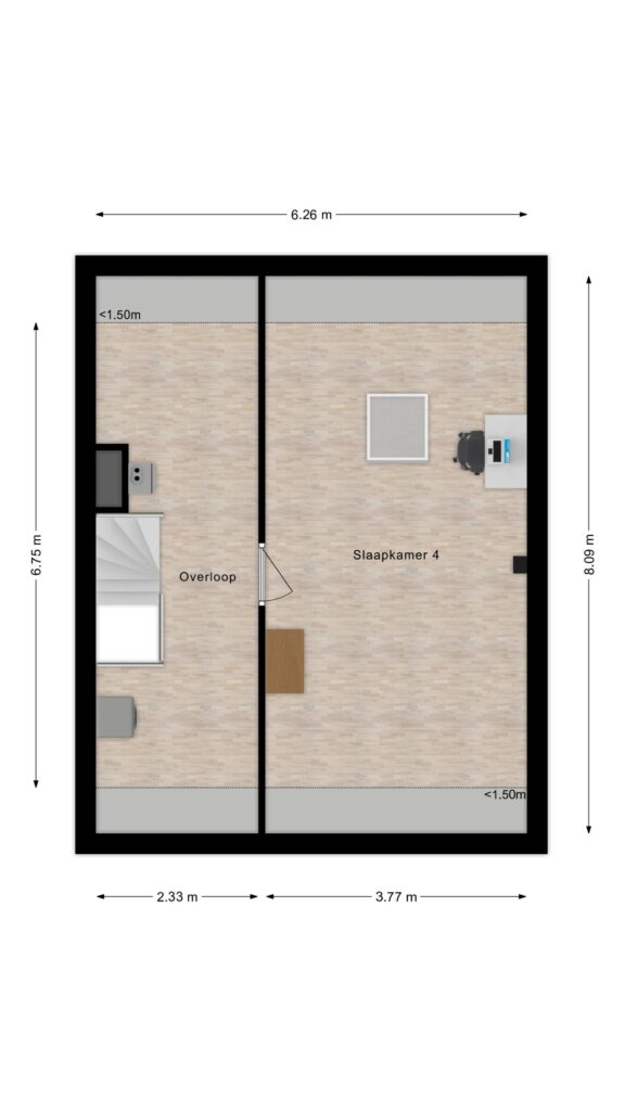 Tweede verdieping: een vierde slaapkamer, ideaal als werkplek, logeerkamer of hobbyruimte. Hier bevinden zich op de overloop de witgoedaansluitingen en de CV ketel (Intergas, 2024). Onlangs is het dak van binnenuit geïsoleerd.